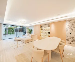 Espace Real Estate presents this fantastic opportunity to own a five-bedroom villa in the highly popular Meadows One development. Sitting on a larger-than-usual plot of approximately 6,501 sq ft, this villa for sale is vacant on transfer, which is ideal for end-users needing to move in straight away. The floor plan is a type 3, with significant upgrades done to it. On the ground floor, as you enter the main door, a study room on the left serves as a creative studio/bedroom with plenty of space to accommodate and also own private bathroom. On the right of the hallway is the kitchen, where all the cupboards and countertops were changed and replaced with high-end design. The villa has a double extension and now has a L shaped open plan downstairs, which benefits from incredible natural light. The first floor has 4 en suite bedrooms, which all lead onto the second family area.